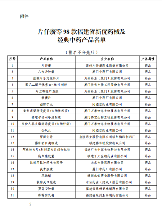 福建省工業和信息化廳福建省藥品監督管理局關于公布片仔癀等98款福建省新優藥械及經典中藥產品的通知
